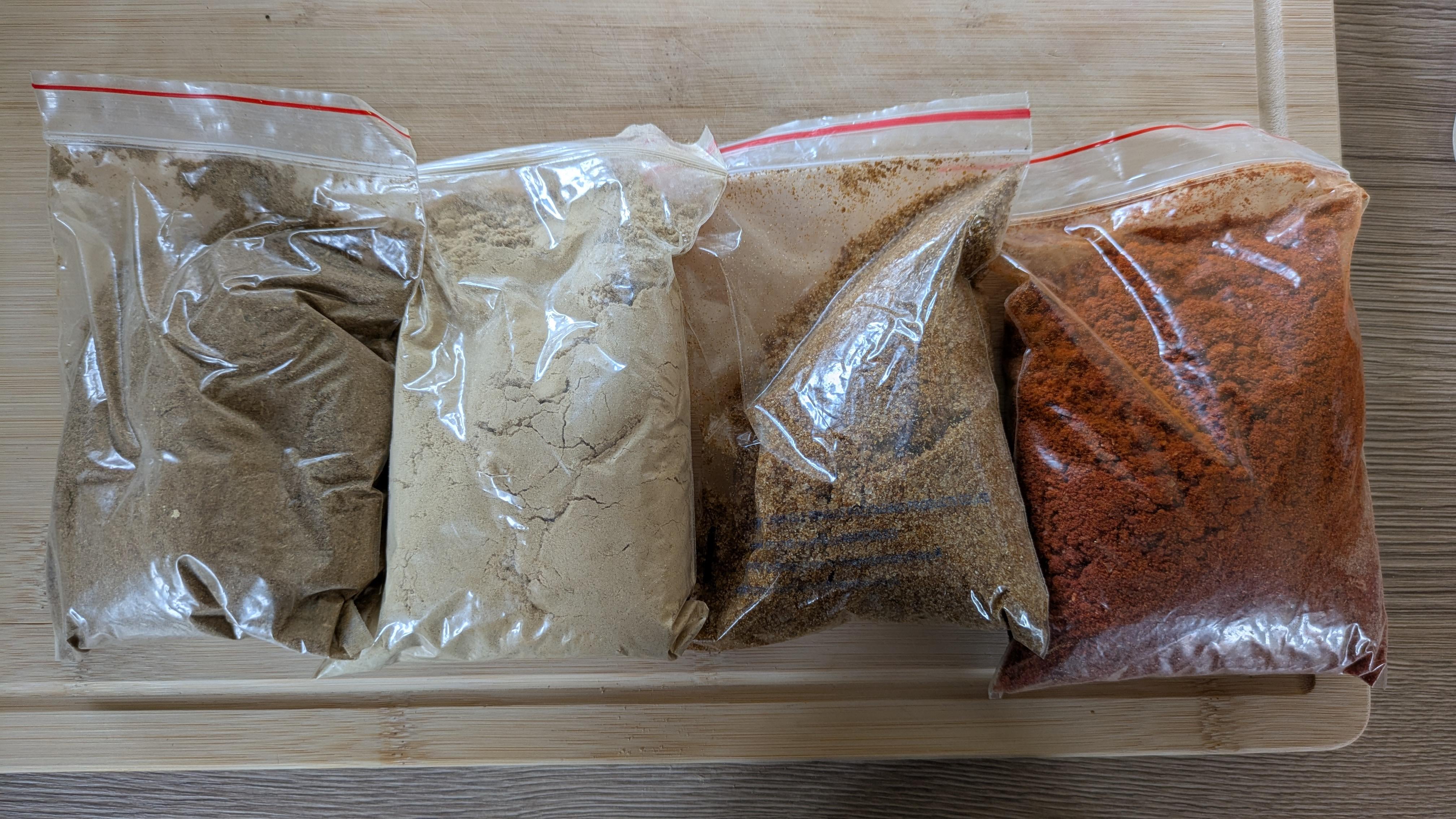 I bought these spices at a market and although the lady tried to explain what they were at the time, I don’t remember what two of them were!