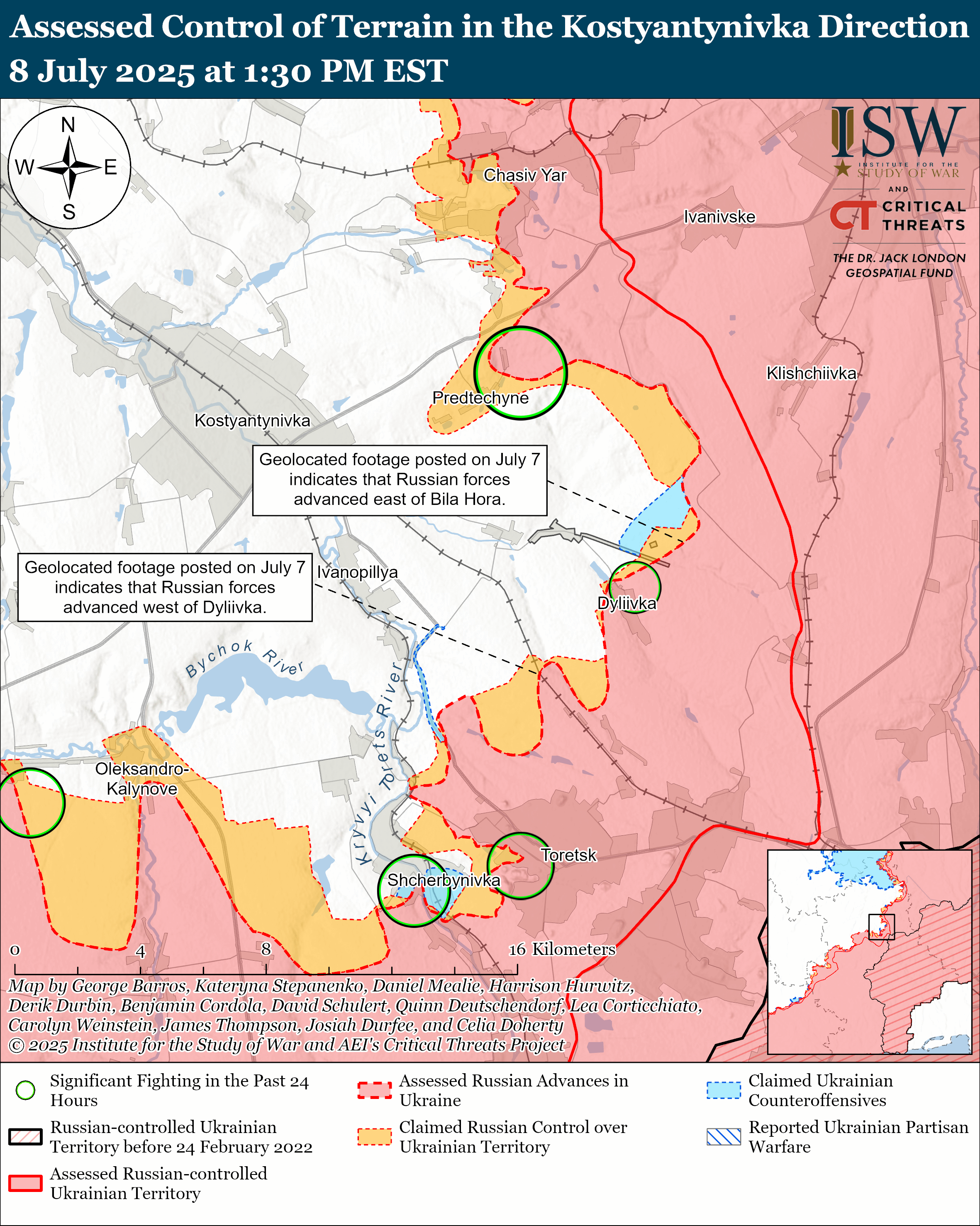 Russian forces conducted offensive operations near Toretsk itself; north of Toretsk near Dyliivka; and northwest of Toretsk near Yablunivka, Oleksandro-Kalynove, Poltavka, and Popiv Yar and toward Katerynivka and Pleshchiivka on July 7 and 8.[57]