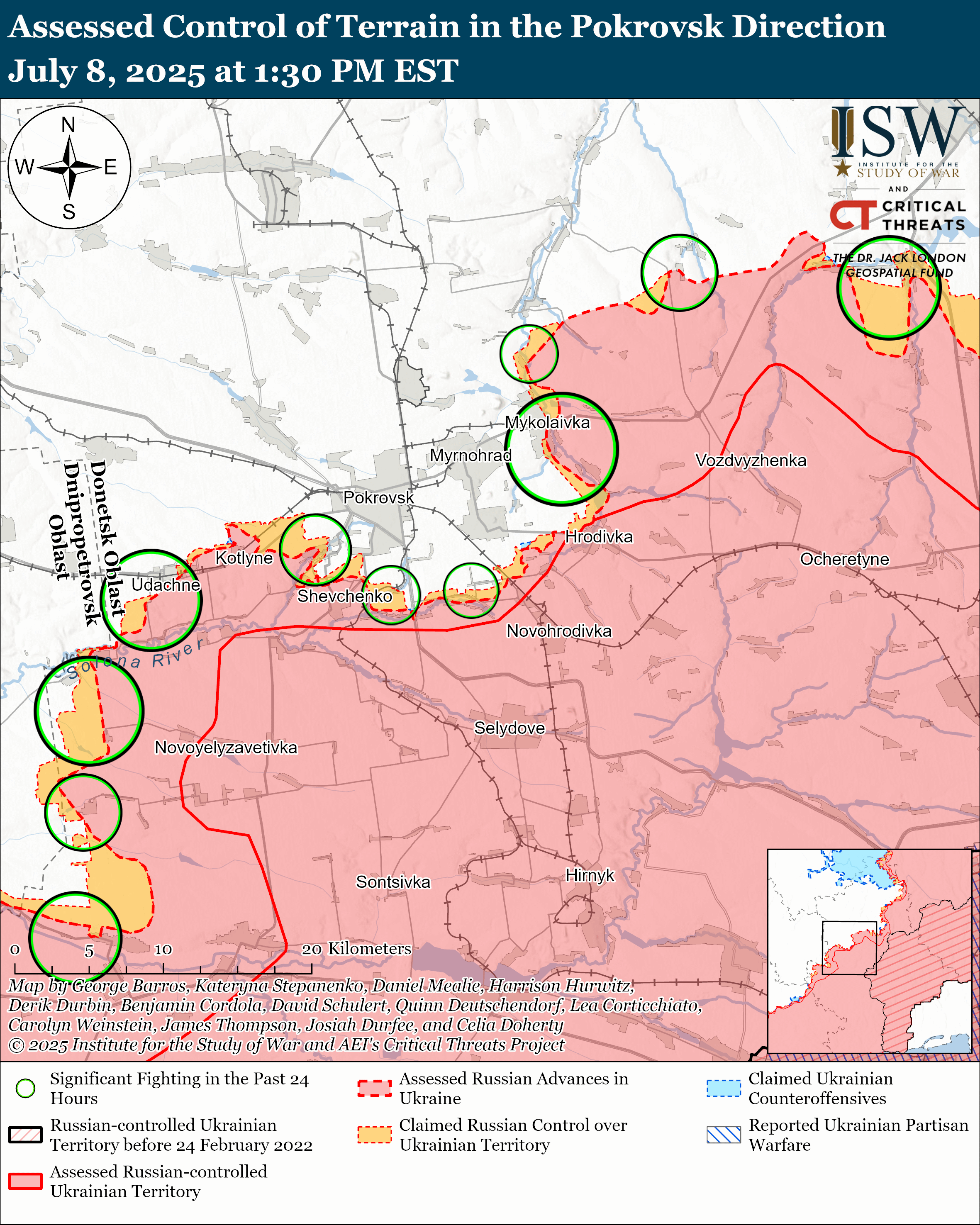 Russian forces continued assaults in the Pokrovsk direction on July 8 but did not make confirmed advances.