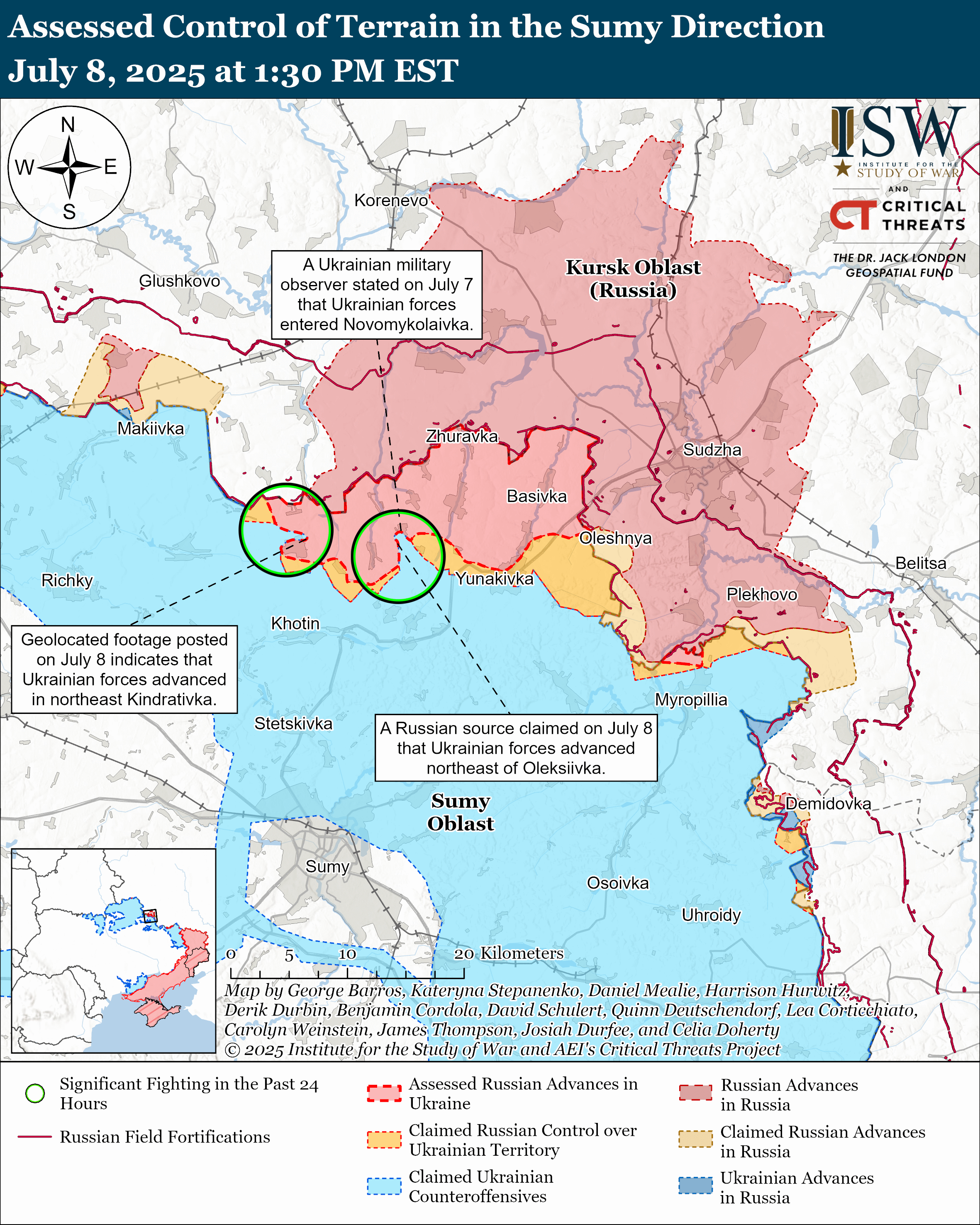 Ukrainian forces recently advanced in northern Sumy Oblast amidst a series of ongoing counterattacks. Geolocated footage published on July 8 indicates that Ukrainian forces recently advanced in northern and northeastern Kindrativka (north of Sumy City).[8] Ukrainian military observer Kostyantyn Mashovets reported on July 7 that Ukrainian forces advanced between Kindrativka and Kostyantynivka (north of Kindrativka) and east of Oleksiivka (east of Kindrativka) and entered Novomykolaivka (northeast of Oleksiivka).[9] A Russian milblogger claimed on July 8 that Ukrainian forces entered Kindrativka from the northwest and Oleksiivka from the northeast.[10] The milblogger claimed that Ukrainian forces seized central and northern Kindrativka and have cut off Russian ground lines of communication (GLOCs) along the C-191502 Novomykolaivka-Volodymyrivka road. The milblogger claimed that the Russian military command deployed elements of the Russian 40th Naval Infantry Brigade (Pacific Fleet) to Kindrativka to support Russian personnel retreating from the settlement. The milblogger claimed that the 155th Naval Infantry Brigade (Pacific Fleet) is fighting to establish a foothold south of Oleksiivka, but that recent Ukrainian advances are complicating this effort.