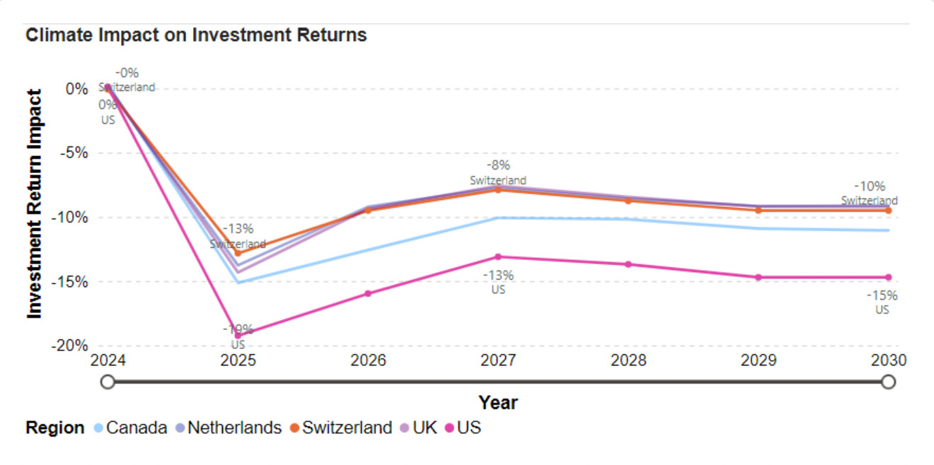 In a November 2024 report, Ortec Finance examined the climate risk exposure of five major pension systems, including those in the U.S. and Canada, and warned that North American pension funds could see a drop of 50 percent or more in investment returns by 2040 if global temperatures rise by 3.7 degrees Celsius under a business-as-usual scenario.