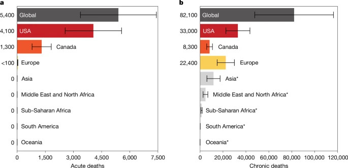 The 2023 Canadian wildfires were the worst on record in at least 20 years, burning millions of hectares of forest and sending massive plumes of smoke across North America and even reaching Europe. This smoke filled the air with tiny, harmful particles (PM2.5), making air quality unsafe in many regions. A recent study notes, in Canada and the U.S., people experienced spikes in pollution that sometimes exceeded health guidelines, and overall, around 354 million people in North America and Europe were exposed to this smoke. Scientists estimate that thousands of people died from short-term exposure, and tens of thousands suffered long-term health impacts.