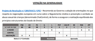 O Chega, a IL, o Pan e o JPP foram os unicos que votaram a favor de todos os projetos de rejeição do chat control independentemente da origem politica.