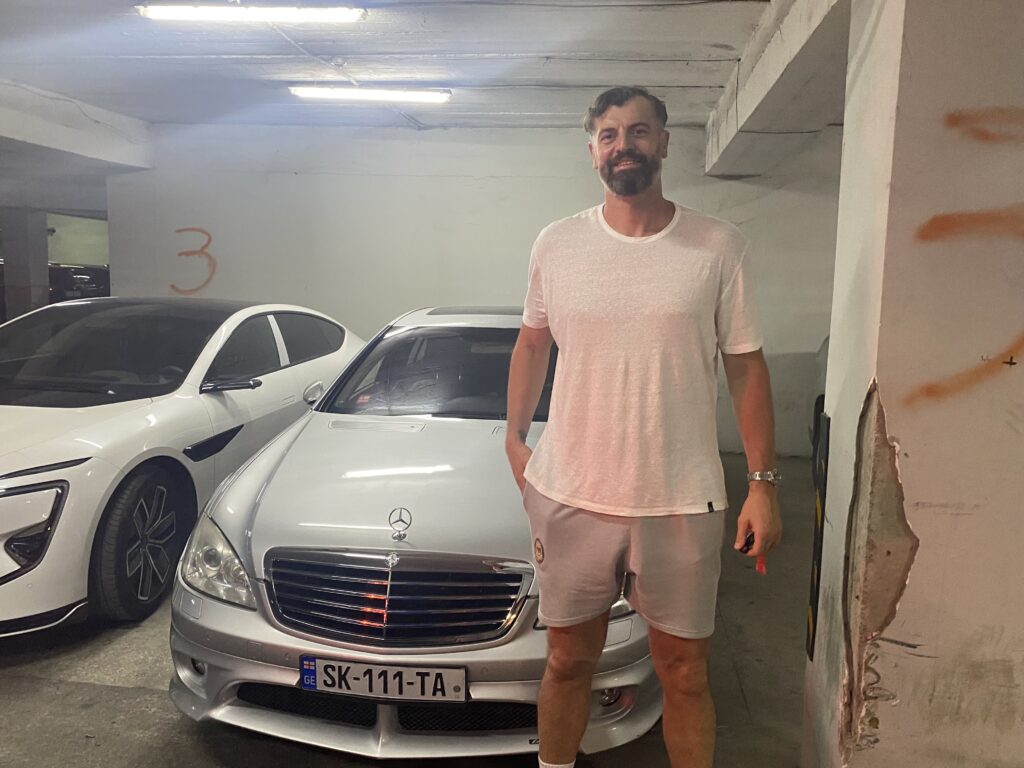 Former Denver Nuggets forward Nikoloz Tskitishvili on July 8, 2025, in front of his Mercedes in his native Tbilisi, Republic of Georgia with the vanity plate “SK-111-TA.” (Chris Tomasson/The Denver Gazette)