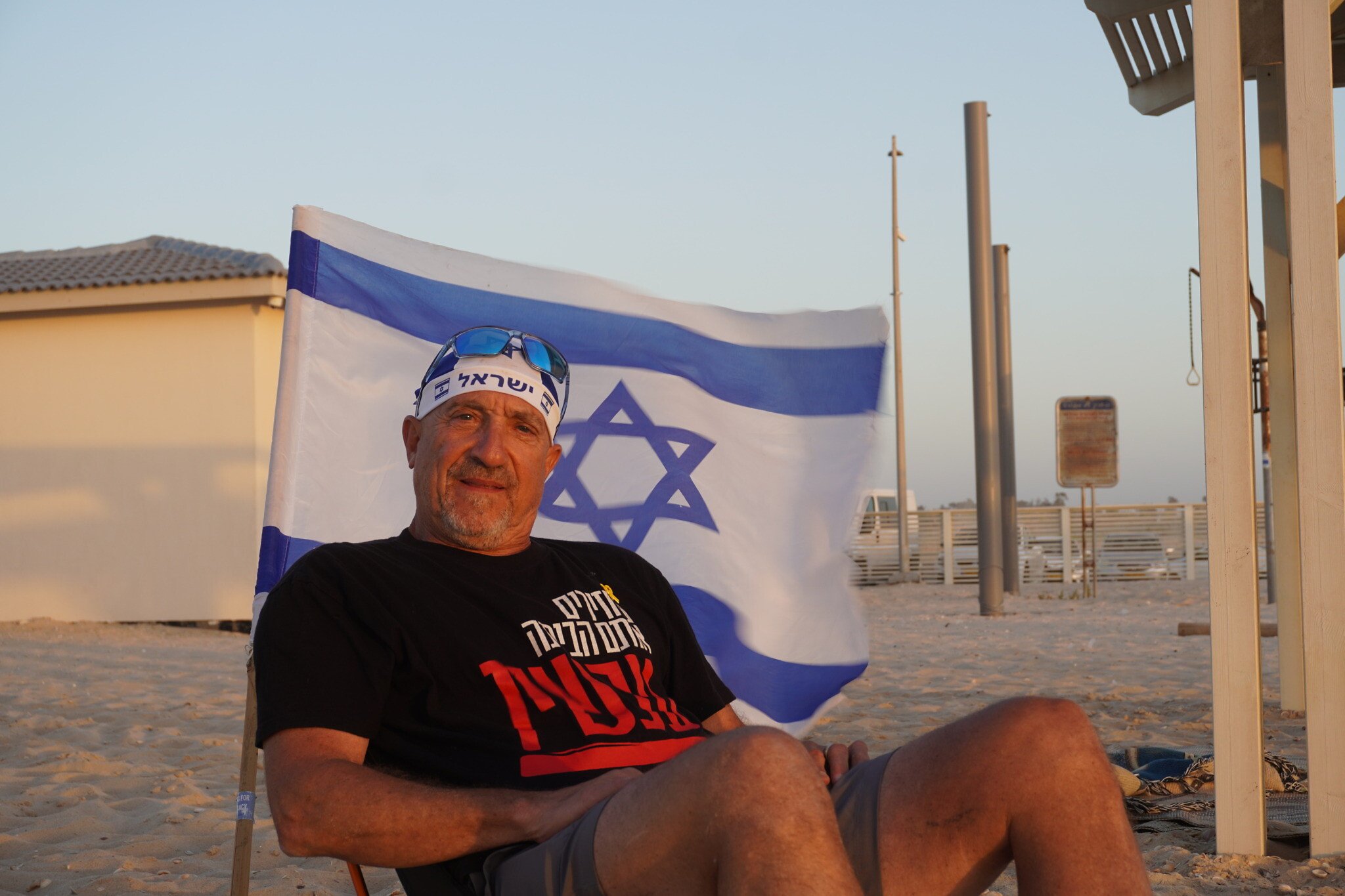 Sporting a shirt from the Hostages and Missing Families Forum and a blue-and-white diving cap, Mike Rudolph was at the beach for the since-canceled opening ceremony.
