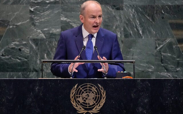 Irish Prime Minister Micheal Martin addresses the 80th session of the United Nations General Assembly, September 26, 2025. (AP Photo/Richard Drew)