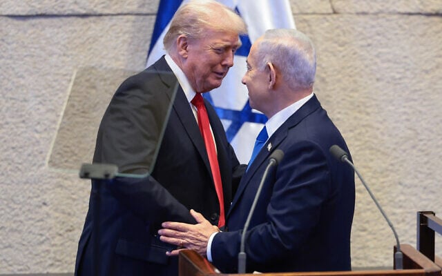 US President Donald Trump (left) talks with Prime Minister Benjamin Netanyahu in the Knesset, October 13, 2025. (Evelyn Hockstein/Pool via AP)