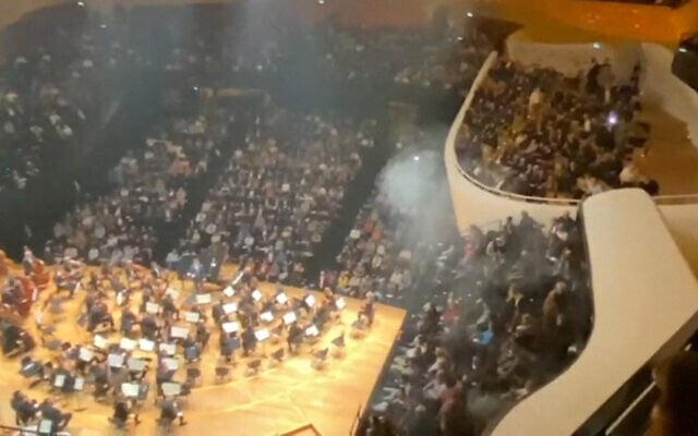 This framegrab taken from a video shows incidents in the Pierre-Boulez Hall of the Philharmonie de Paris, after a person ignited a smoke bomb during a concert by the Israel Philharmonic Orchestra on November 6, 2025. (Jean-Michel TRANSON / AFPTV / AFP)