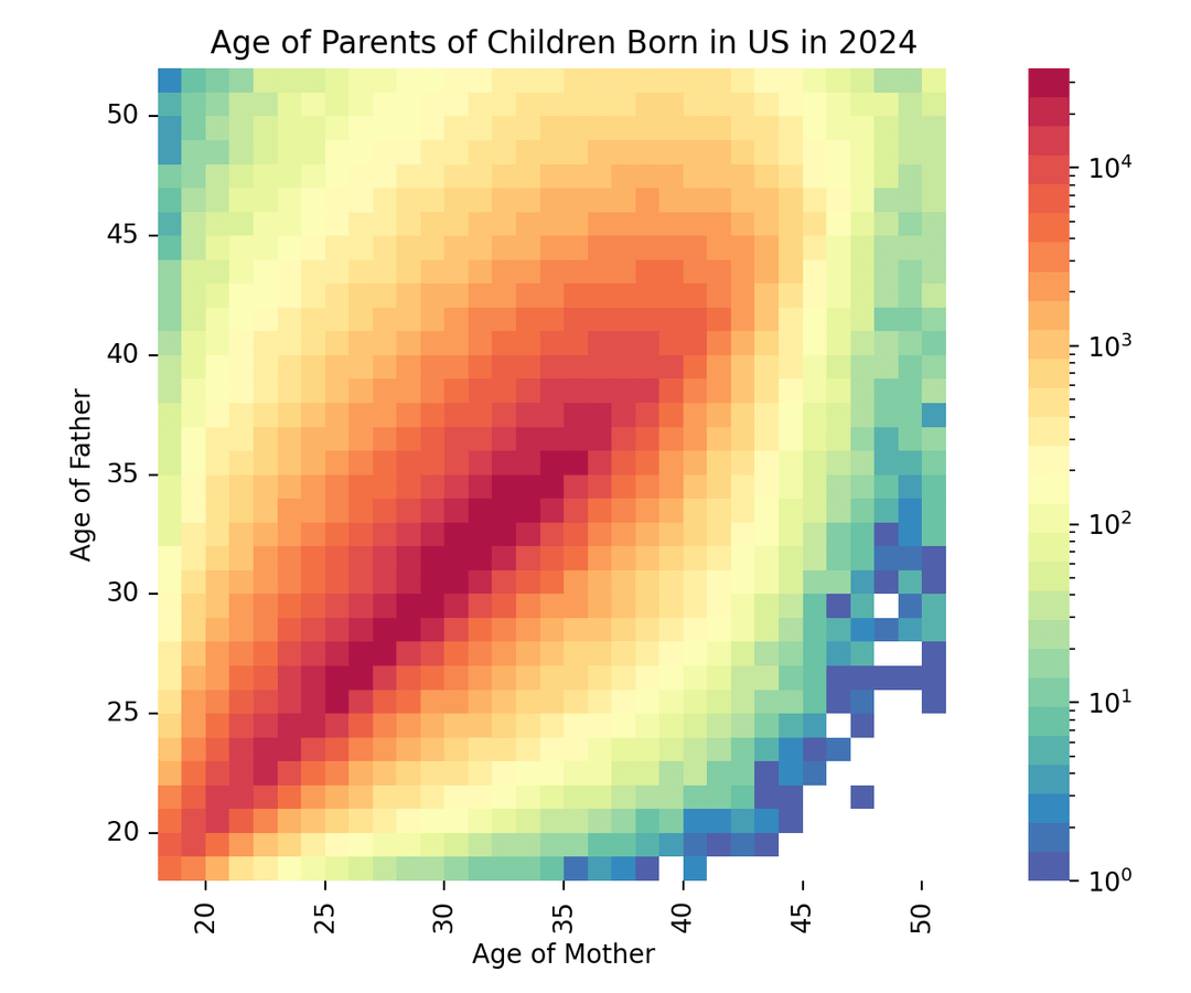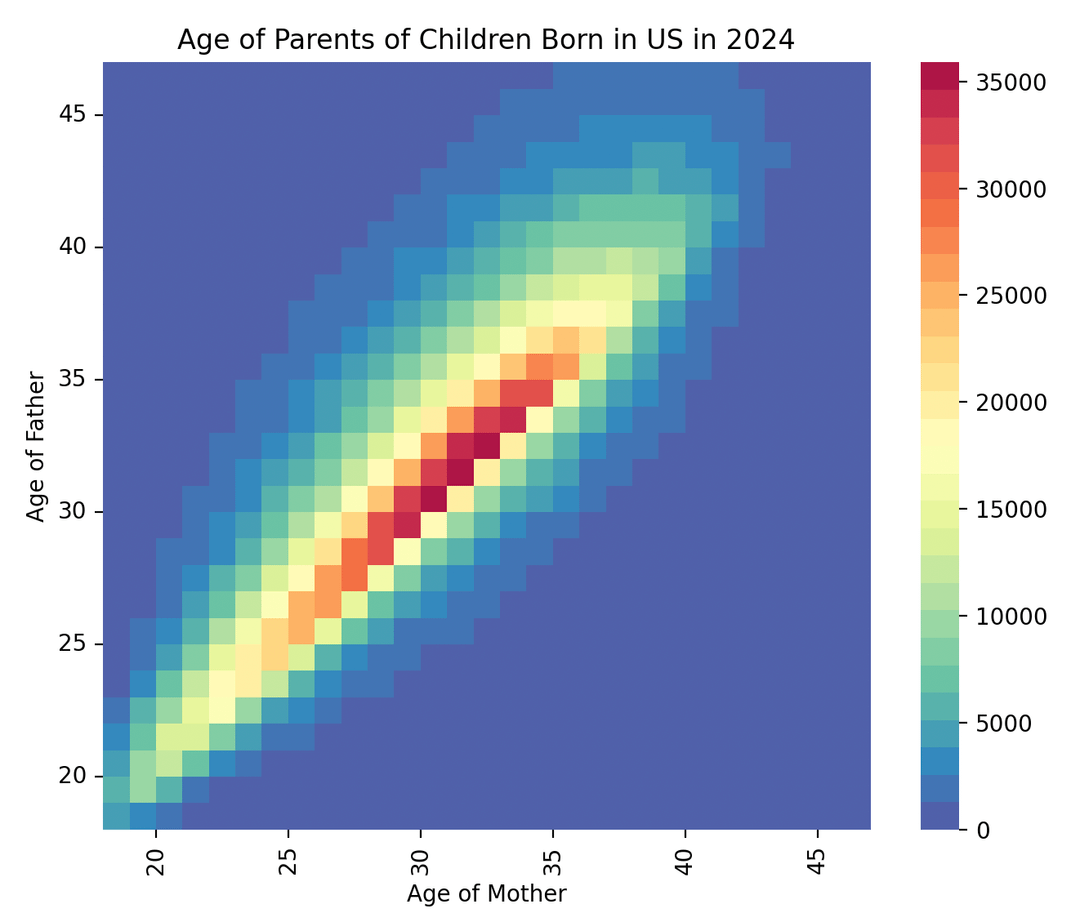 I made this plot using Matplotlib and the data from the US CDC vital statistics data which is publicly available here: https://www.cdc.gov/nchs/data_access/Vitalstatsonline.htm . The data is on the over 3.5 million births of children in the US in 2024.