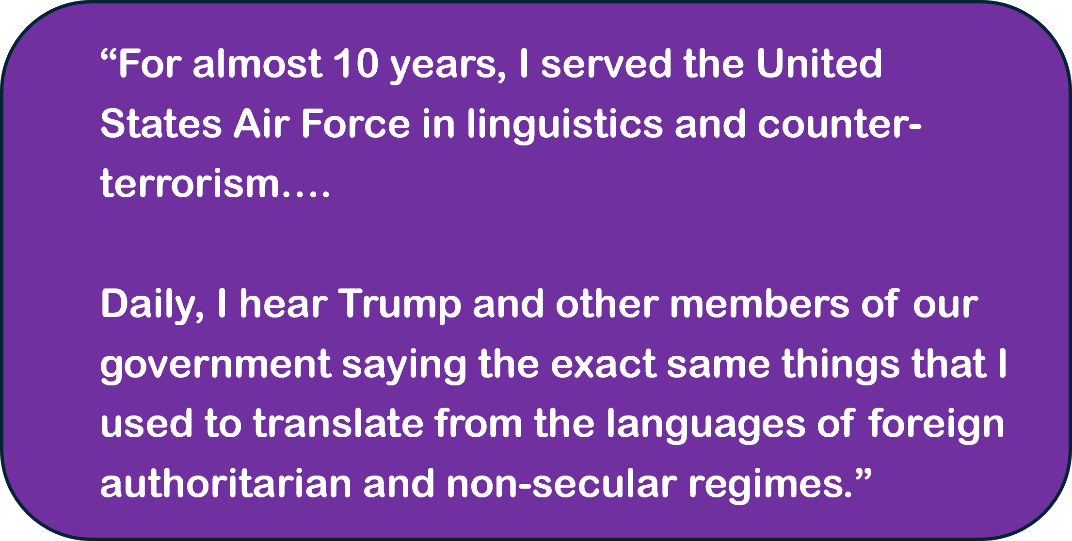 For almost 10 years, I served the United States Air Force in linguistics and counter-terrorism. My bachelor’s degree is in Intelligence Studies with a concentration in Terrorism Studies, and I hold additional certifications in United Nations and State Department courses. I wish I had a more positive outlook for the state of affairs in the country I honorably served, but as each day passes bringing new assaults on the guardrails of our democracy, the intelligence analyst in me constantly writes situation reports in my head. They mirror far too closely the situation reports I wrote during my career as Trump and his Administration rapidly transform the United States from a functioning democracy (even if not absent of issues) into a competitive authoritarian regime. Daily, I hear Trump and other members of our government saying the exact same things that I used to translate from the languages of foreign authoritarian and non-secular regimes. Exact same words; just this time in English. Having spent my service career guarding US interests and citizens against the effects of other regimes while also consistently being horrified by the conditions to which the citizens of those regimes are subject, the increasing similarities between former target countries and my country now equally horrify me. In this guest post, I lay out the parallels I find most obvious, but it is in no way an exhaustive selection.