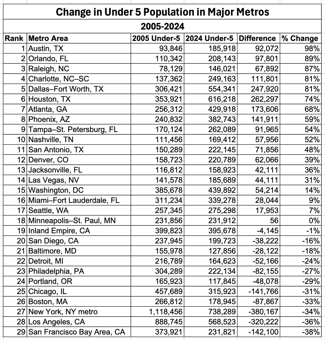 This needs to be normalized by population growth of the MSAs over the same time period. It is hard to tell if this is simply general population growth or if there is something unique about the population change of children under 5. Would be interested to see population growth vis a vis population growth of <5 under population.