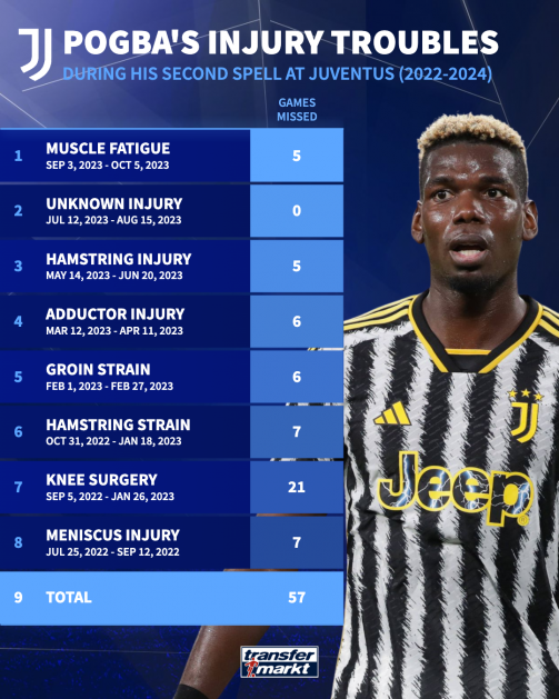 It’s almost impossible to determine how long Pogba will require to reach full match fitness after so long without playing. At his best, Pogba was one of the leading midfielders in the world but his return to Juventus was severely impacted by injuries before his ban. As the graphic below illustrates, the midfielder played just 12 games in just over a year after returning from Manchester United and missed 57 games through injury. The ankle injury sustained at Monaco will be a slight concern and how his body will hold up to a return to action will be paramount to his prospects.