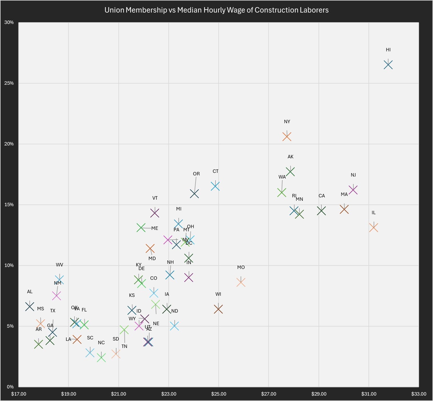 devourke on November 21, 2025 11:11 pm Tool: Excel Source: – Union Membership by State data is from https://unionstats.com / the CPS – Median wage information is from a custom query on the BLS website: https://data.bls.gov/oes/#/indOcc/Multiple%20occupations%20for%20one%20industry