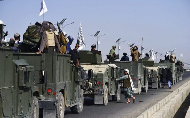 Taliban fighters atop Humvees prepare before parading along a road to celebrate after the US pulled all its troops out of Afghanistan, in Kandahar on September 1, 2021, following the Taliban’s military takeover of the country. (Javed Tanveer/AFP)