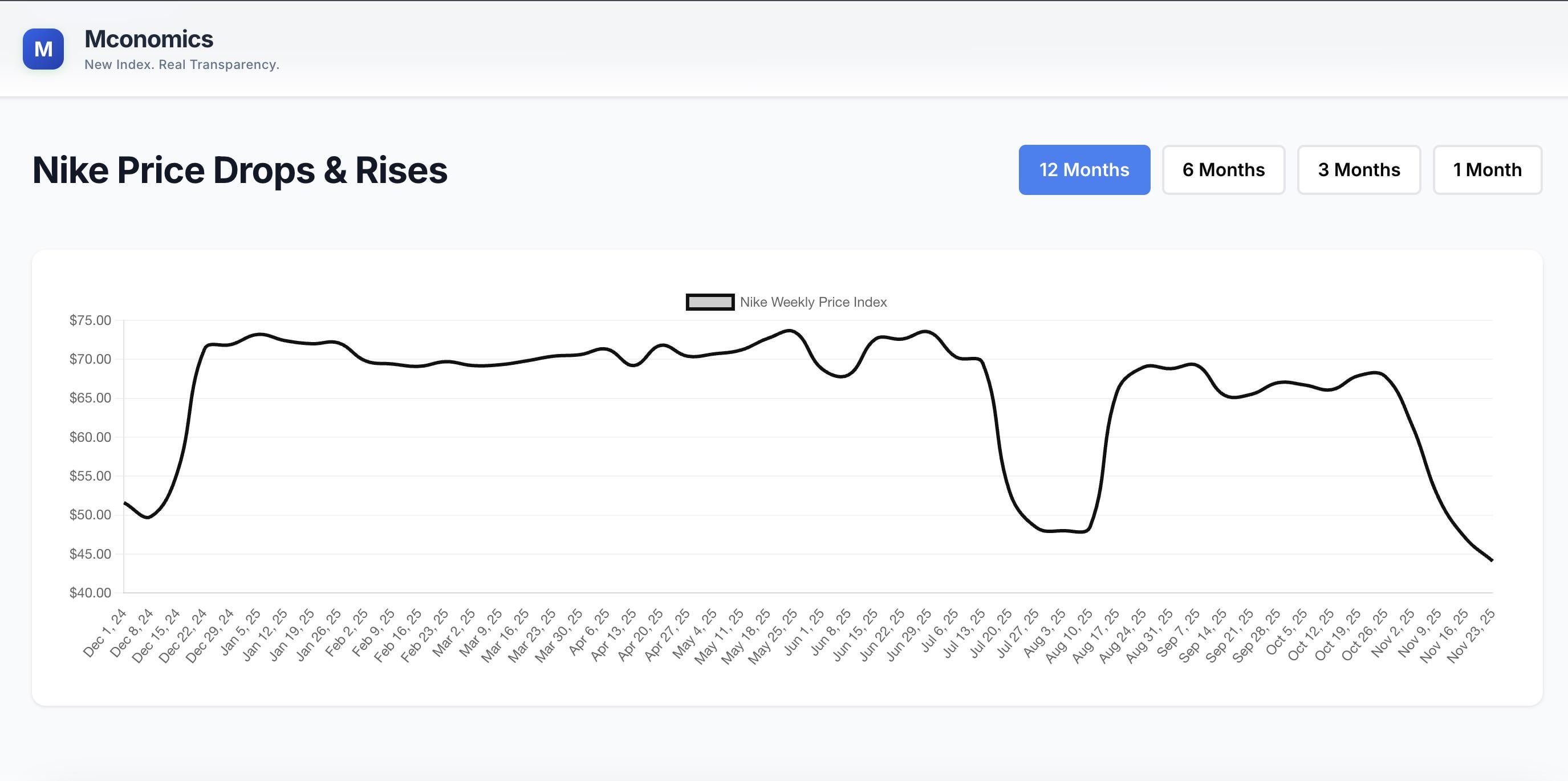 This chart shows that Nike website products cost about $44 compared to $67 from a month ago. It is still cheaper when we compared to last year. Hope we find more early deals with data.