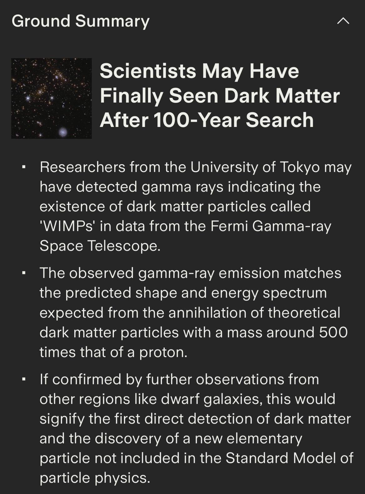 Scientists in Tokyo may have detected the first actual hard evidence of dark matter. I'm so happy to exist in the timeline where we have the first image of a blackhole and possibly the confirmation of dark matter. I can't get over this. (Link in comments)