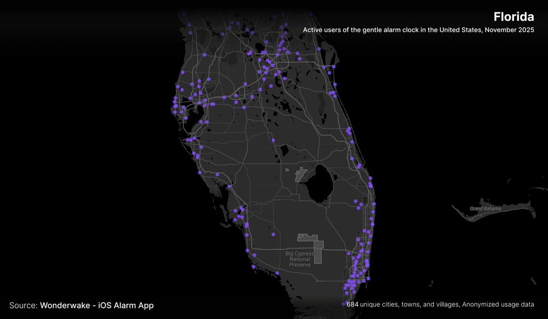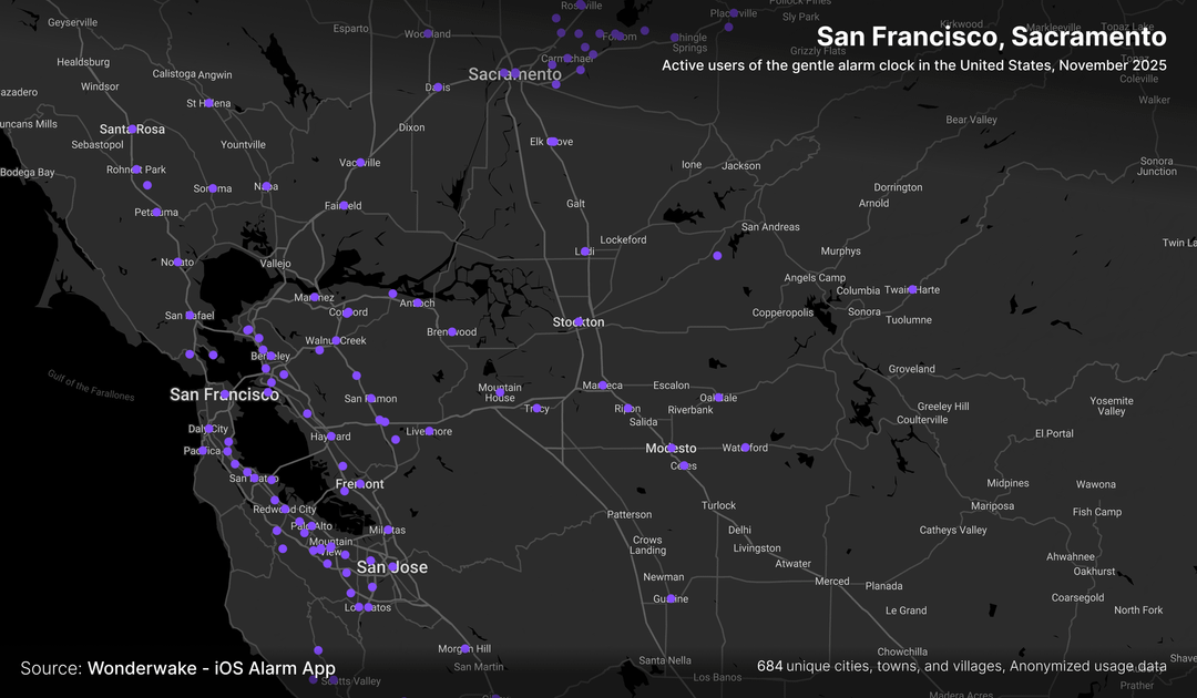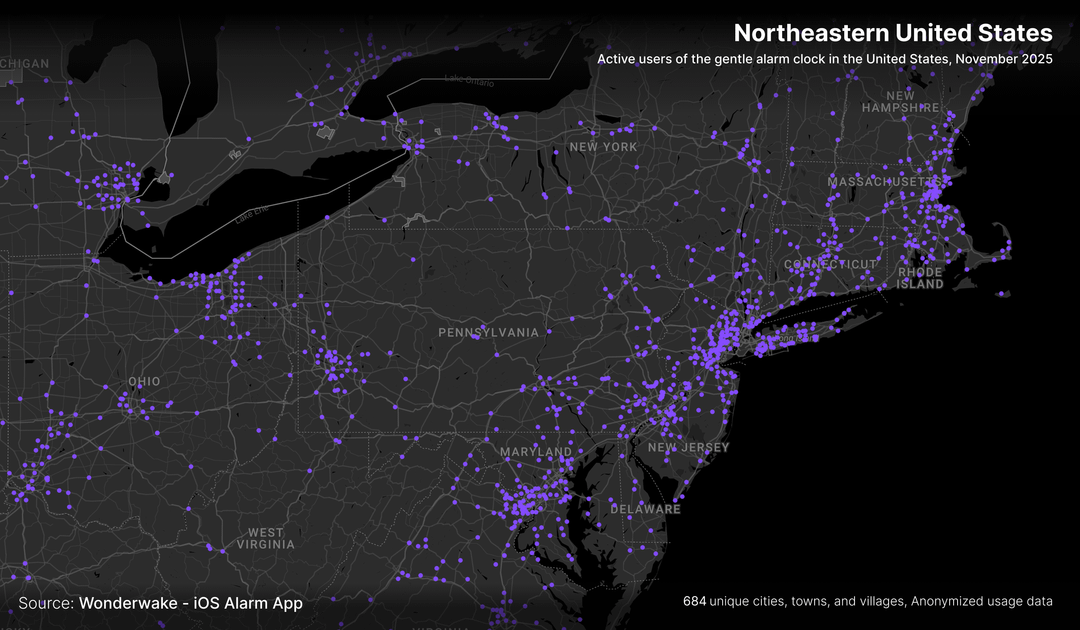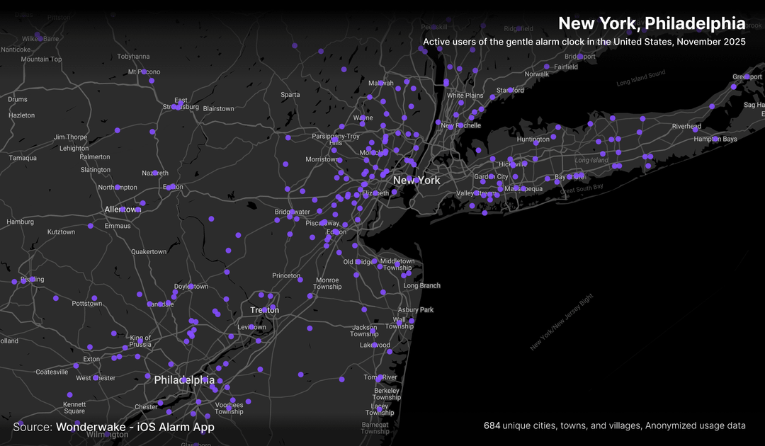does this actually show where people wake up gently, or just where people own iPhones and bother installing niche alarm apps? Like, if we overlay this with income data / urban density, I bet the correlation would be wild