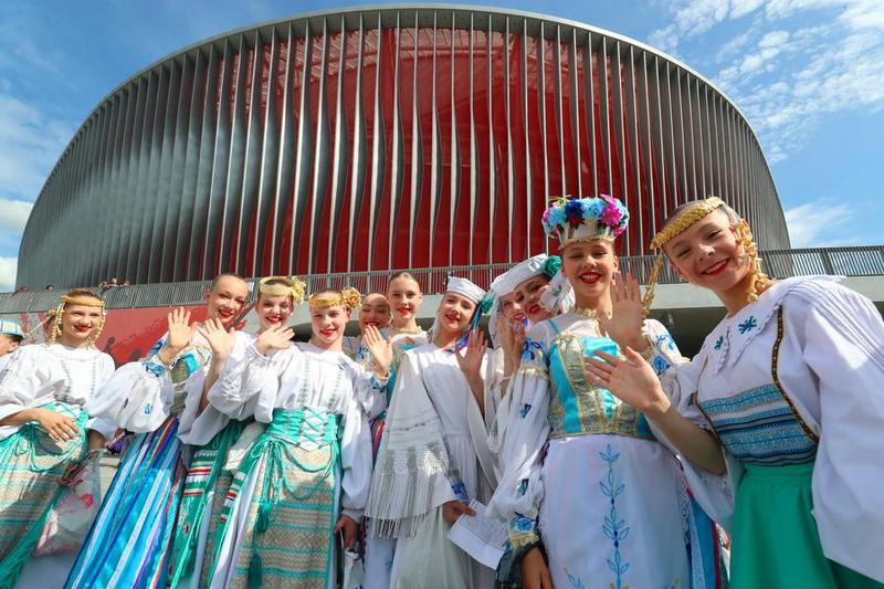 Women dressed in traditional attires pose for a group photo in front of the Belarusian National Football Stadium, a landmark project built with Chinese support, in Minsk, Belarus, June 7, 2025. [Photo/Xinhua]