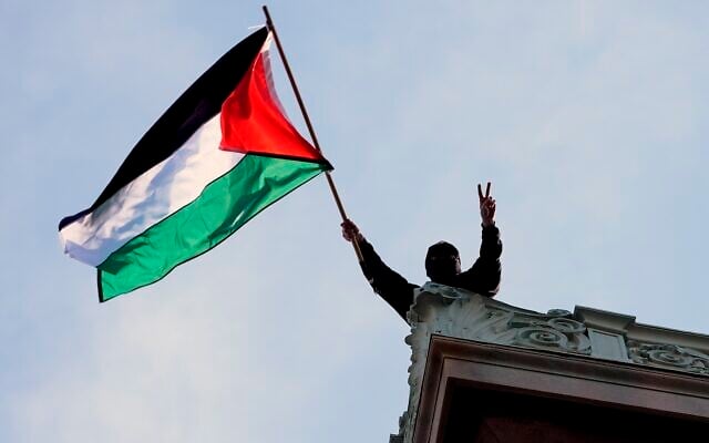 A student protester waves a Palestinian flag above Hamilton Hall on the campus of Columbia University, April 30, 2024, in New York. (Pool Photo/Mary Altaffer)