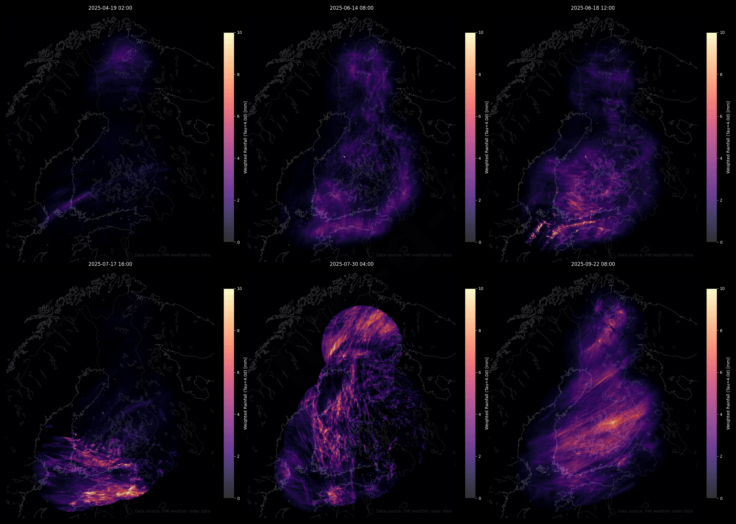 [OC] Hourly Finland rain radar data with 4 days decay time (roughly soil moisture map)