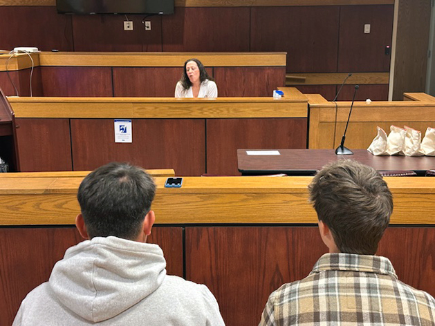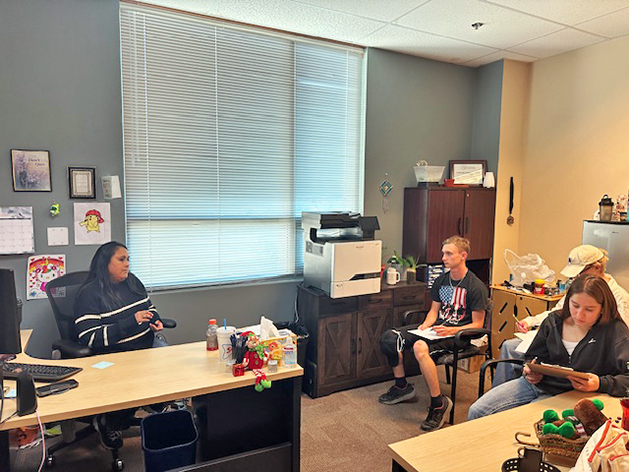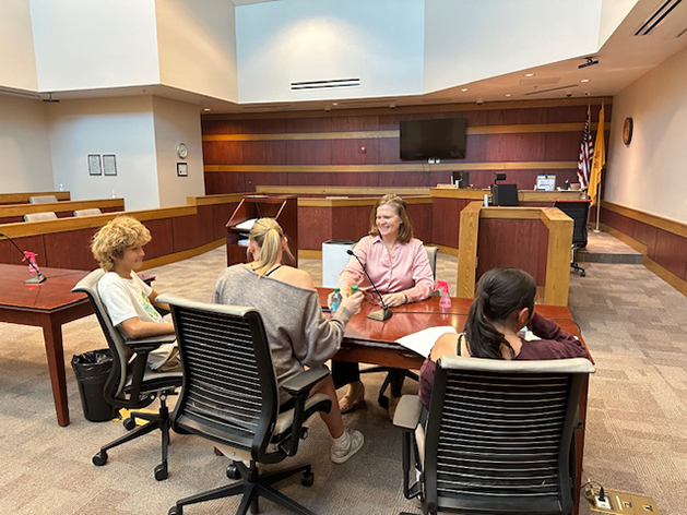 Los Alamos Municipal Court staff member Monica Schwiner speaks to Los Alamos High School students from English Teacher Lori Thompson’s Sports Lit class in her office recently at the Justice Center. Photo by Kirsten Laskey/ladailypost.com