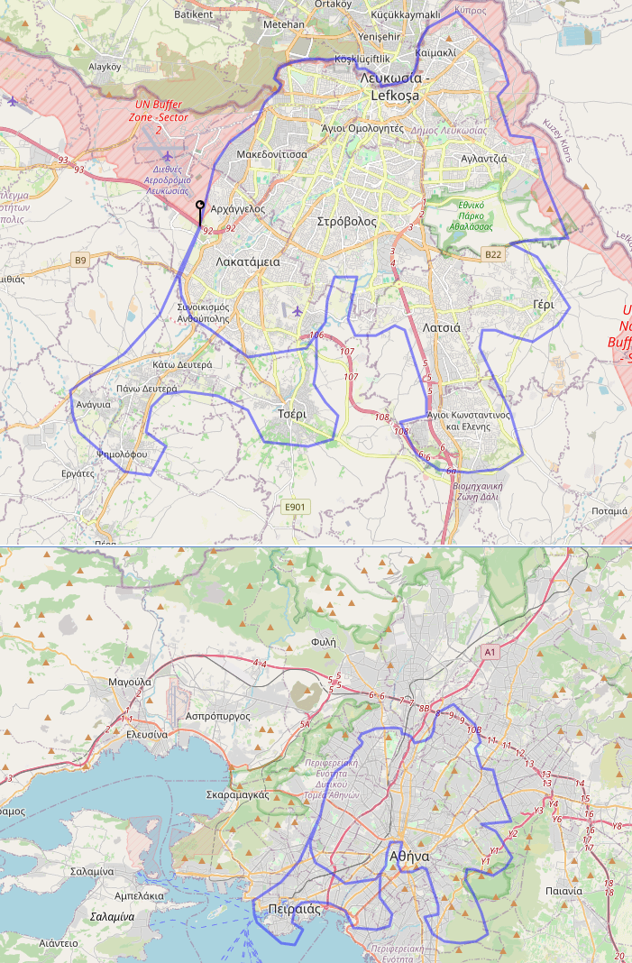 1. I do hope the shape of nicosia is taken from a map at the same scale with the map you are comparing it with . Because if not, this doesnt make sense.