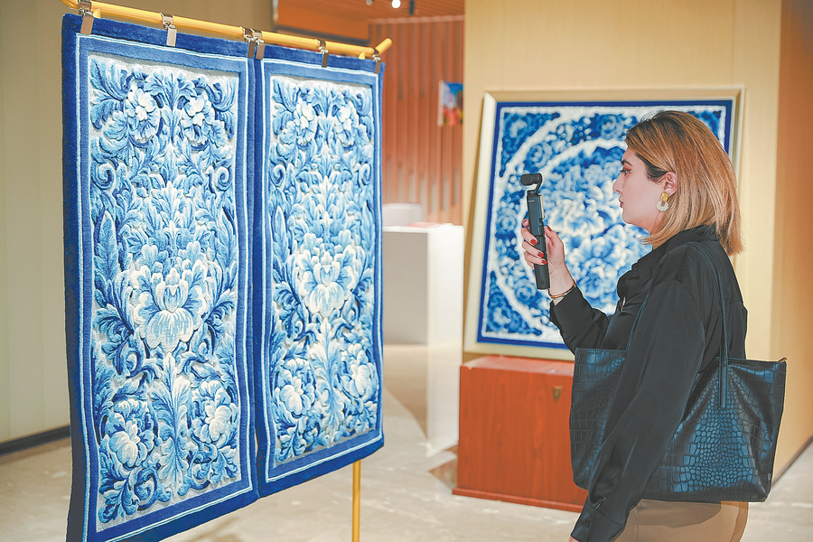 A dozen carpets, each bearing distinctive cultural patterns and the ancestral skills of China and Serbia, adorn the Beijing Overseas Cultural Exchange Center in late November.