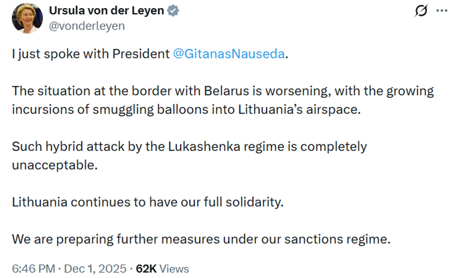 Such hybrid attacks by the Lukashenka regime are absolutely unacceptable. We continue to stand in full solidarity with Lithuania. We are preparing further measures within our sanctions regime.