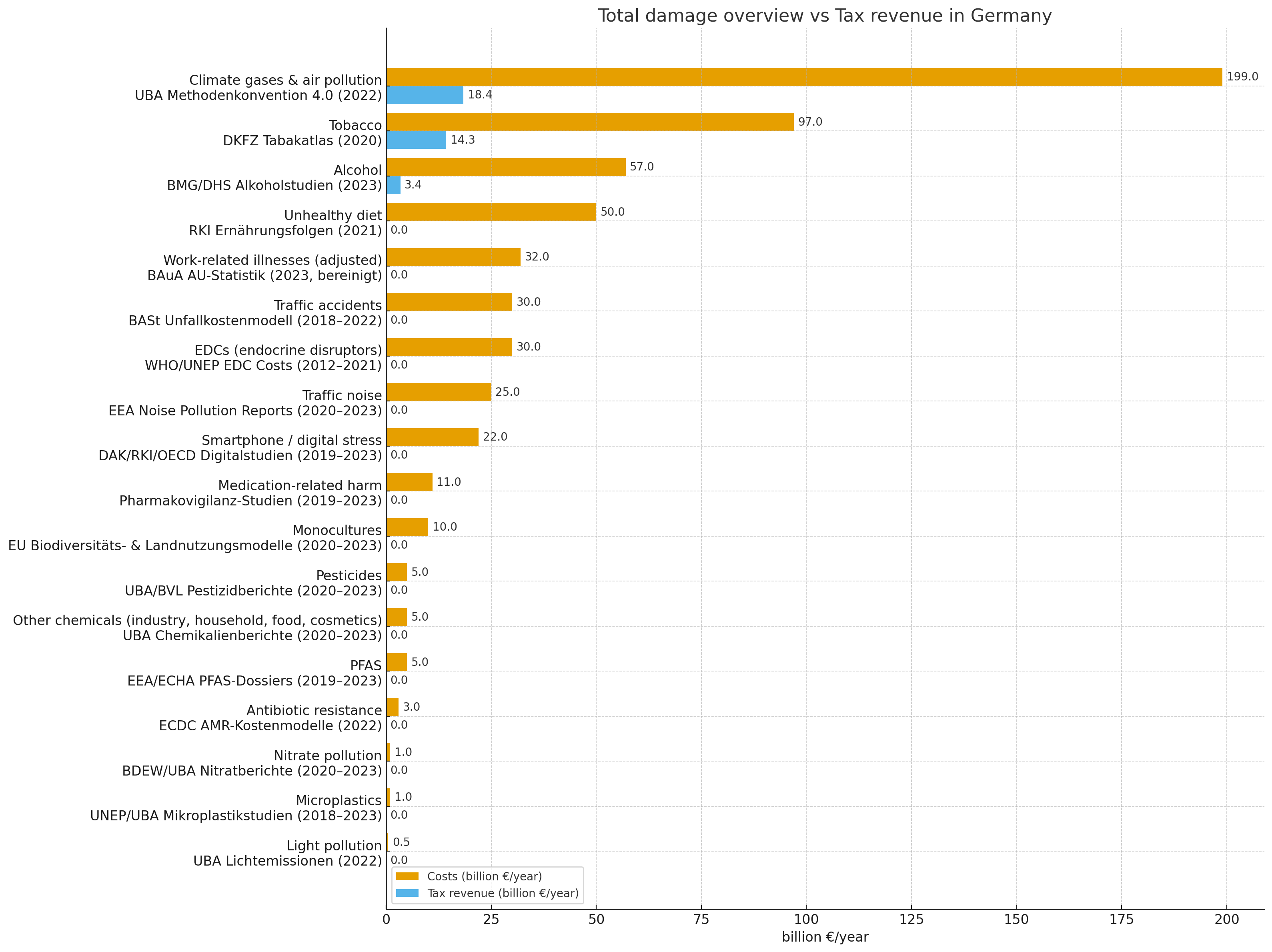 For a more realistic representation, it should be taken into account that in Germany there are no earmarked taxes. The societal costs are certainly well illustrated here, but they are offset by revenues from the respective industries.