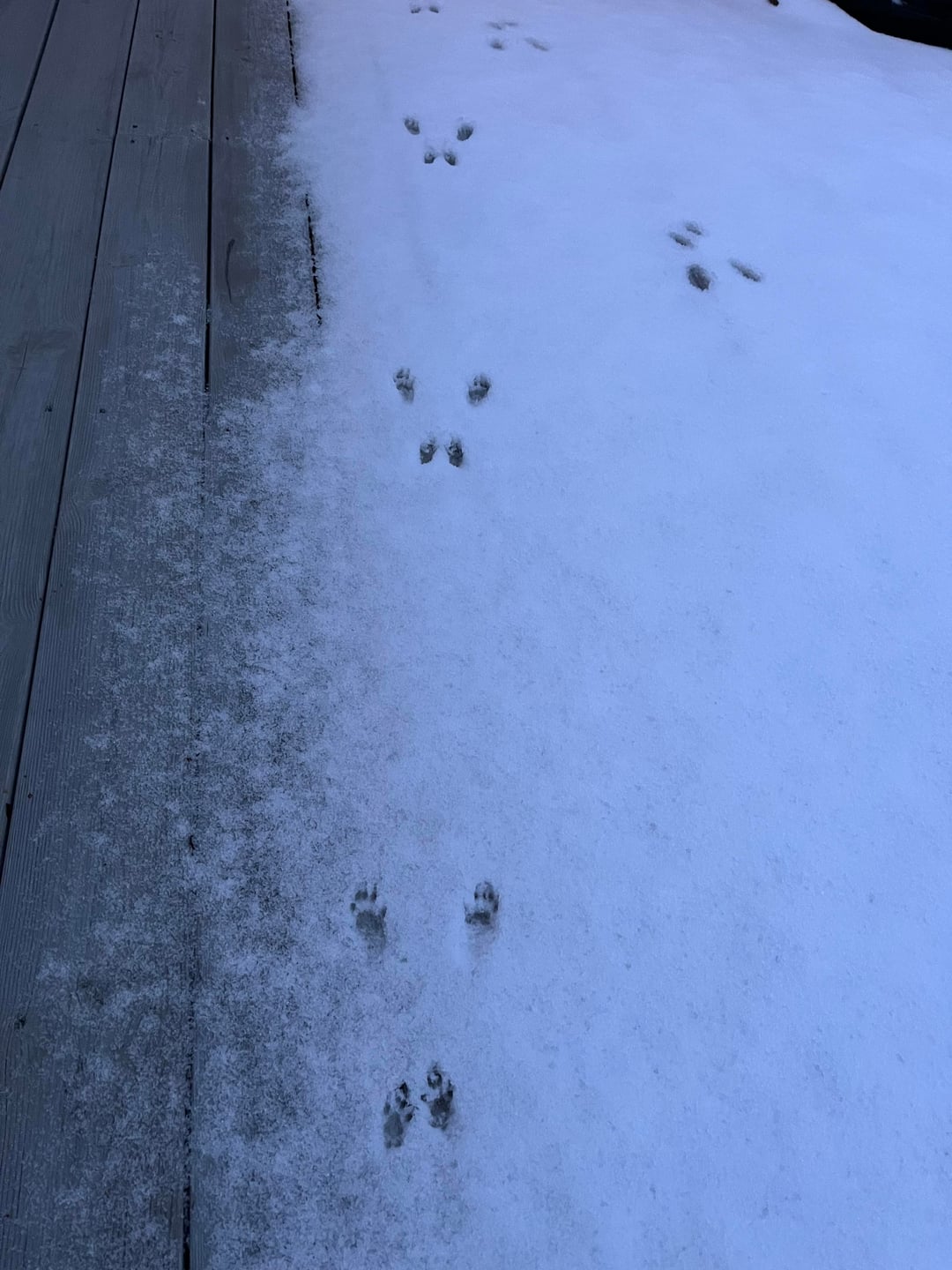 Could folks please help me identify what animal made these tracks on my porch? We live in Nesodden and I suspect maybe a squirrel but I’m not sure since I have never seen one in the yard.