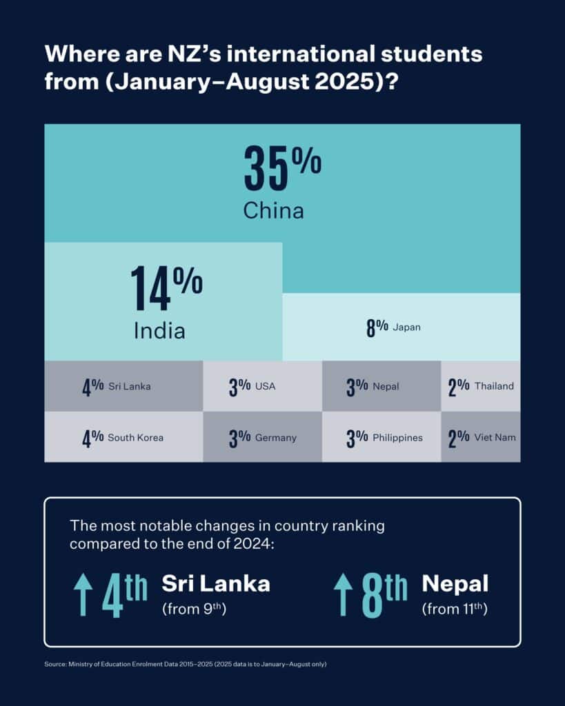 China remains New Zealand’s largest source of international students, making up 35% of enrolments between January and August 2025. India follows with 14%, while Japan accounts for 8%. Several emerging markets also strengthened their presence: Sri Lanka and Nepal recorded the biggest jumps compared with the end of 2024, rising to 4th and 8th place respectively.
