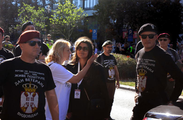 Surrounded by her security detail, Dijana Hrka (in white) greets a journalist during the commemorative march for the victims of the Novi Sad disaster.