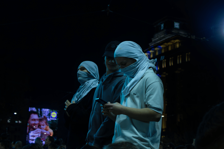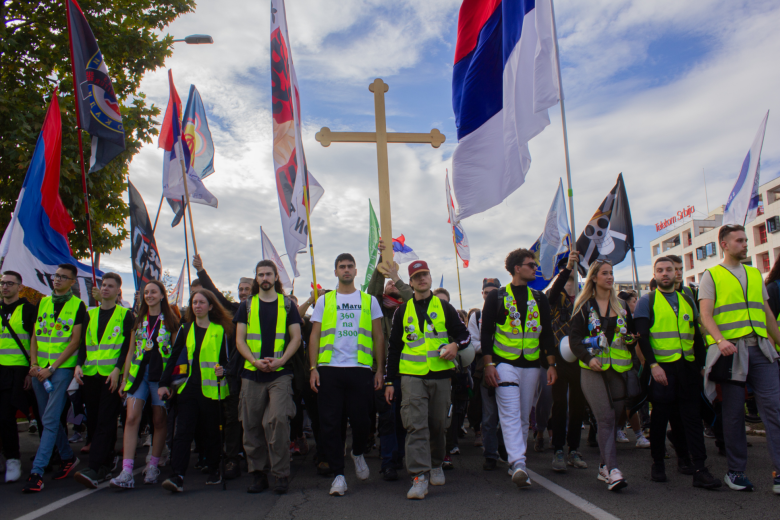A mix of symbols appears as the marchers set out for Novi Sad on 30 October: crosses, pins saying “F*** SNS,” flags labeled “Kosovo is the heart of Serbia.” These are signs of a post-ideological movement, with ideologies juxtaposed rather than mixed. “We don’t know if this movement will be progressive,” Brajer says. “We don’t fight just for ourselves. The far right is advancing across Italy, Czechia, and the U.S. Our student’s fight encompasses a broader fight against authoritarianism, like 1968 in France.”