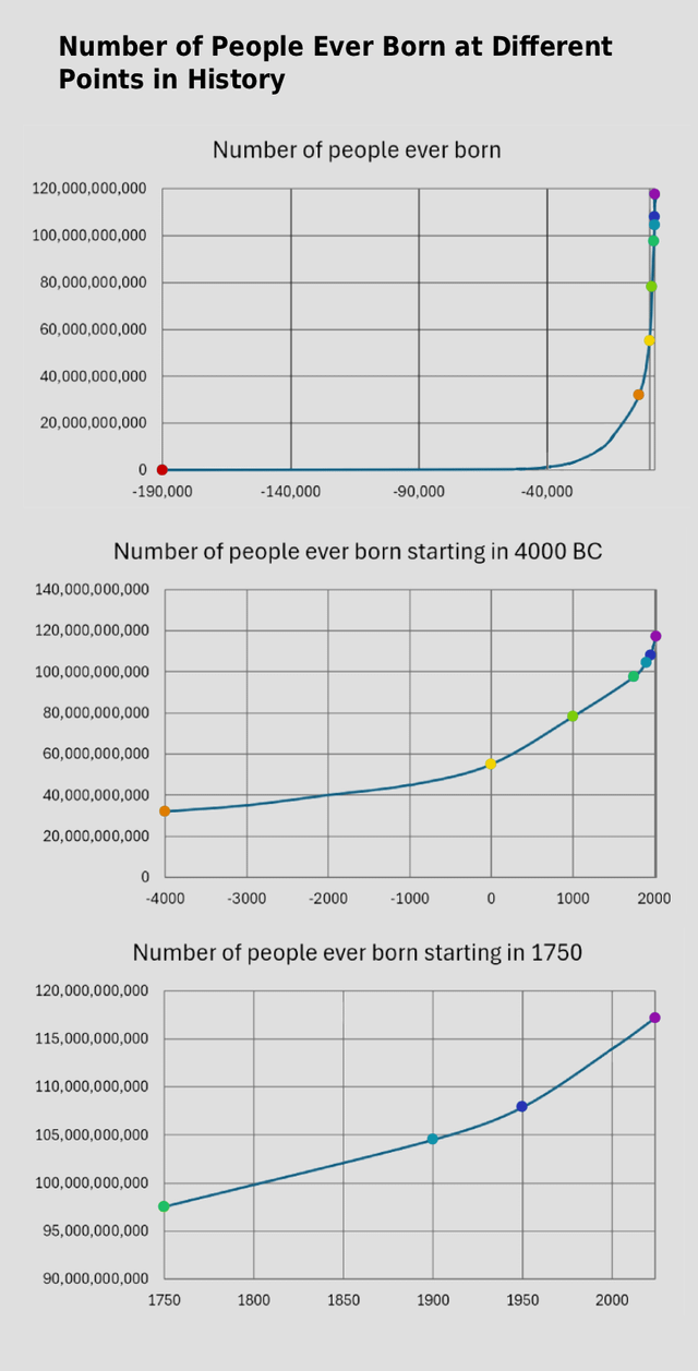 Sources are the PBR article “How Many People Have Ever Lived on Earth?” and the United Nations report “World Fertility 2024.” The graphic was made mostly in Photopea, and line graphs were made in Excel.