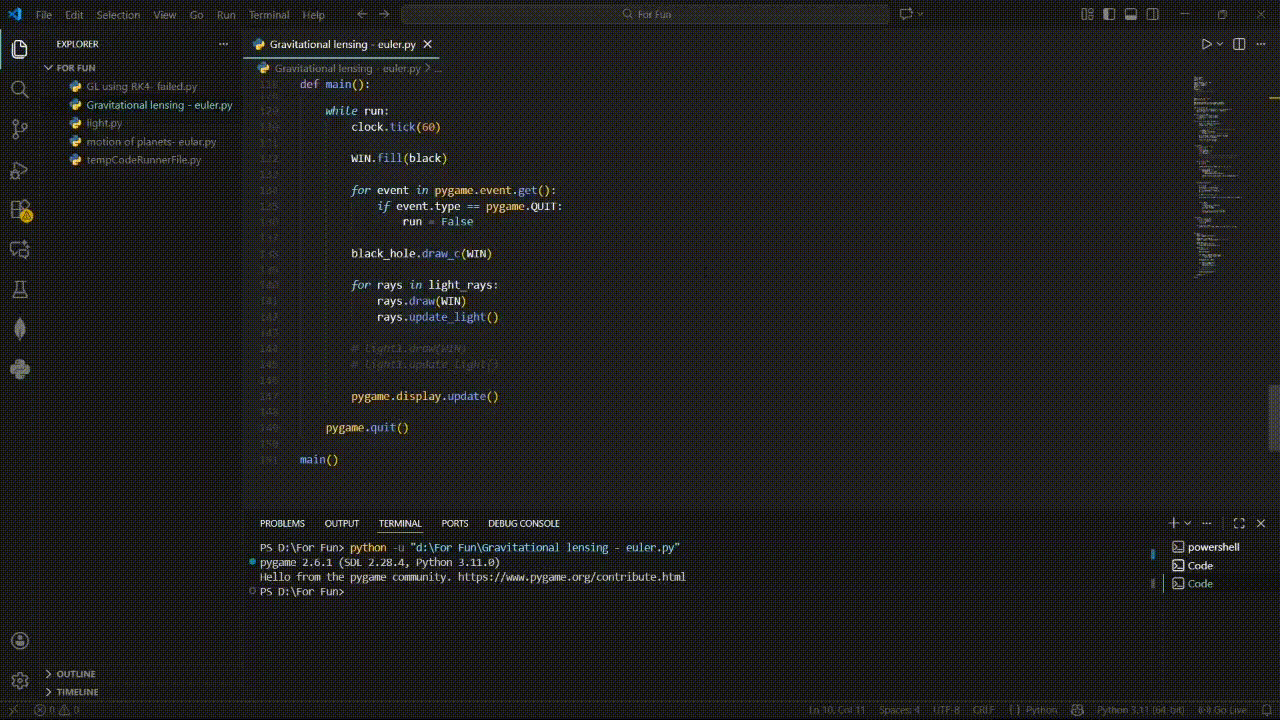 For the theory part, starting with the schwarzschild metric, then using the concept of symmetries and killing vectors and also the normalisation condition for null geodesic, you will get all the equations needed to get the path of light around any mass in the spacetime. And for the simulation, I decided to use euler's method to solve those equations.