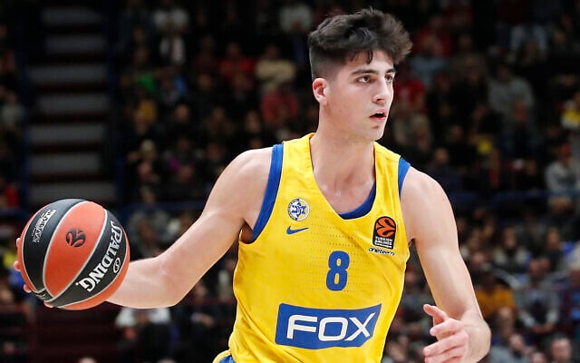 Maccabi Tel Aviv’s Deni Avdija controls the ball during the Euro League basketball match between Olimpia Milan and Maccabi Fox Tel Aviv, in Milan, Italy, November 19, 2019. (AP Photo/Antonio Calanni)