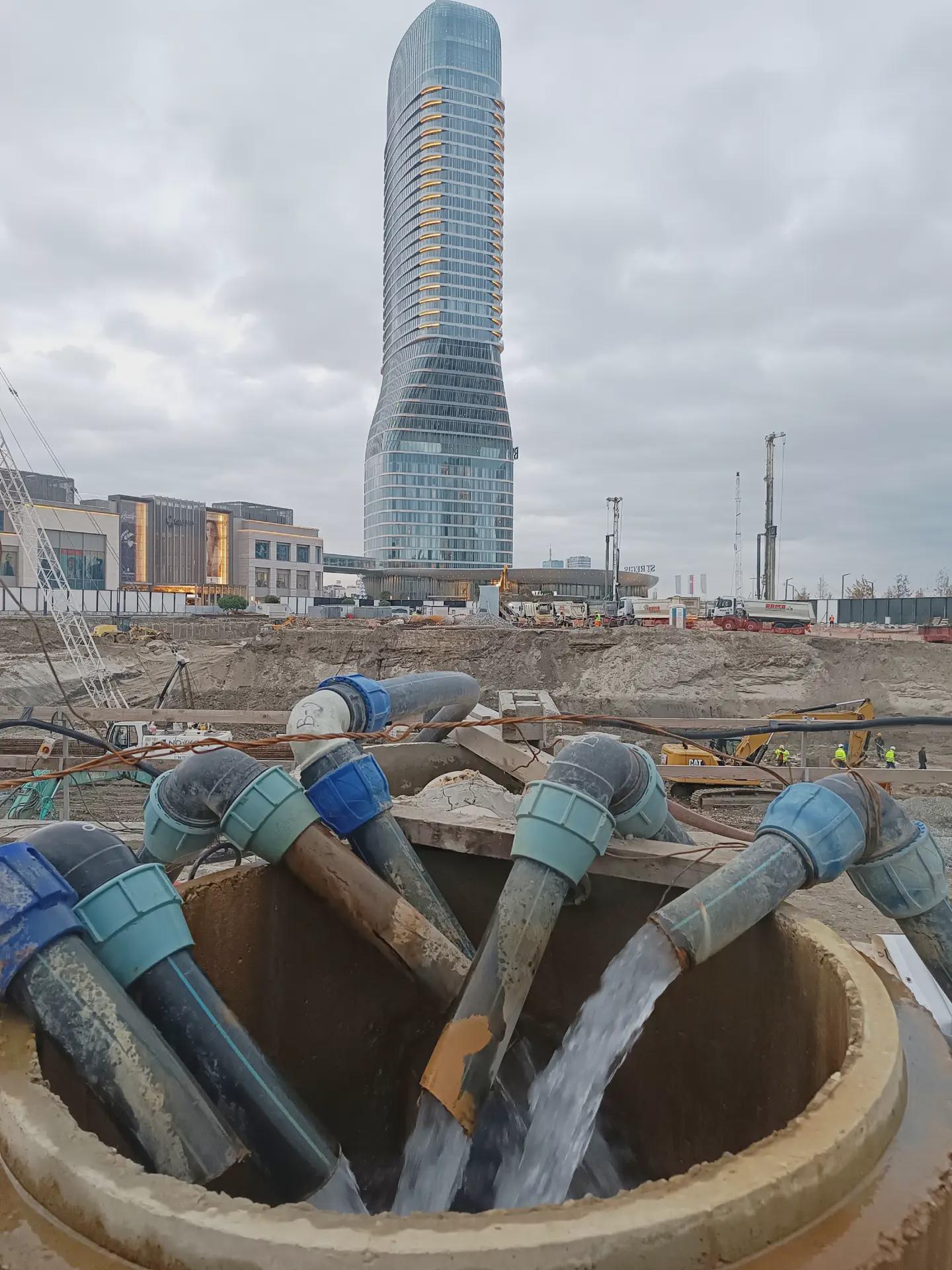 Na slici su prikazane drenažne pumpe za obaranje nivoa podzemne vode *tokom izgradnje* podzemnih etaža. Po obodima iskopa se “svrdlom” izbuše bunari (rupe) dubine recimo 20-30 metara, i prečnika nekih 20-30 cm, a zatim se u tu rupu stavljaju cevi da se rupa ne bi obrušila. U ovako formirane bunare se na dno spuštaju pumpe sa filterima i crevima , koje u nekom radijusu od recimo 10 m oko bunara spuštaju nivo podzemne vode. Ako se ovi bunari dovoljno dobro rasporede, može se lokalno oboriti nivo podzemne vode kako bi se podzemni nivoi gradili u suvom.