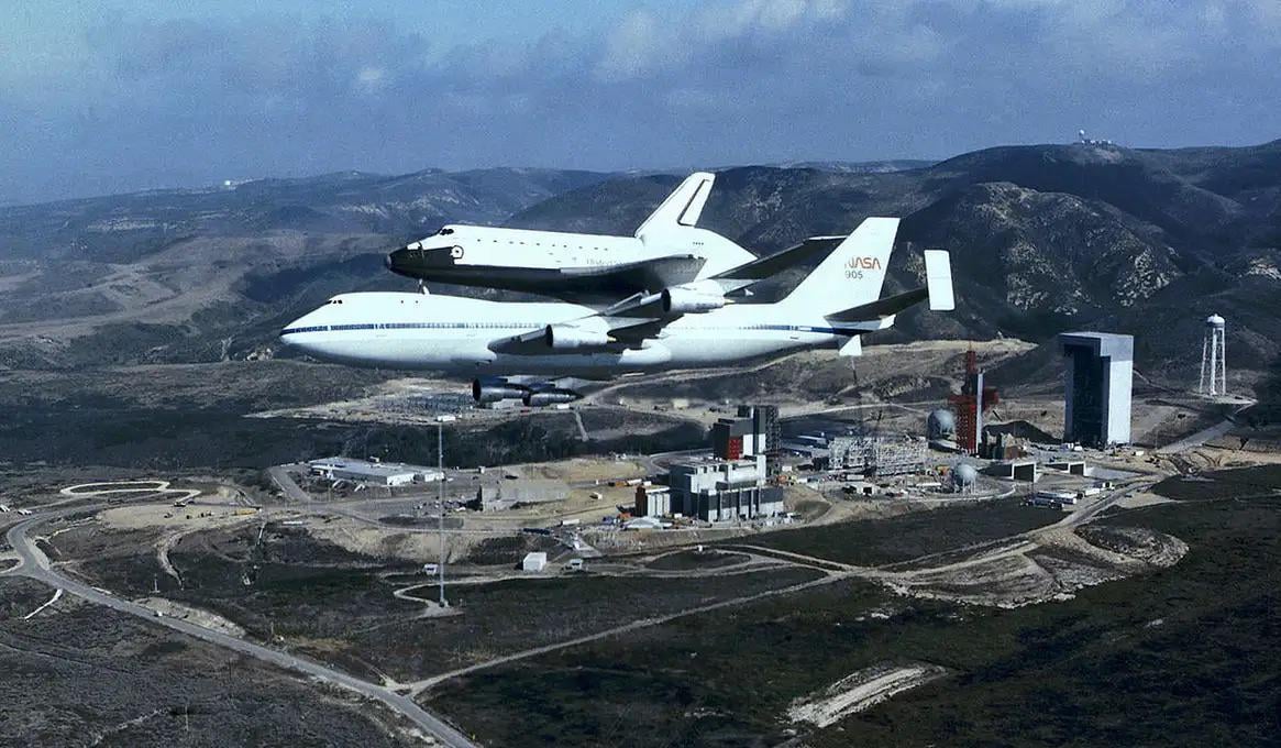 Seems like a nice bandwagon to jump on. USAF publicity photo taken of space shuttle Enterprise being transported above Space Launch Complex 6 at Vandenberg AFB in California in 1984. https://i.redd.it/a7lw0eoyft5g1.jpeg