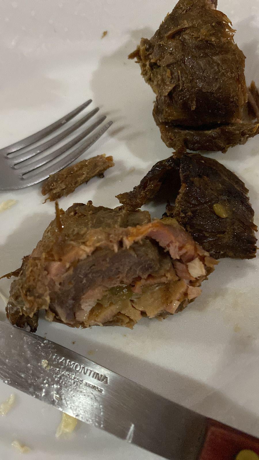 We make it with meat, stuffed with bacon and onions and rolled up, tying it up with string before cooking it. It might not be 100% identical, but it’s probably what they intend to be making this whole time! I’ll leave a picture of my plate from 2023 as I don’t usually take pictures of food and it’s something we only eat on special occasions such as christmas, though my grandma would make it for me as birthday gifts because of how much I liked it.