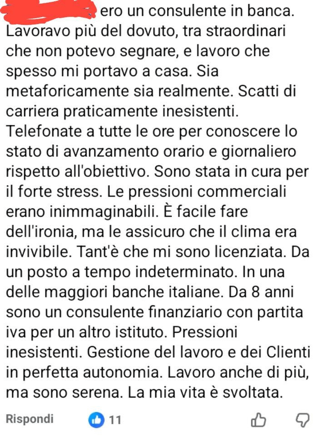 Il mio problema è che negli altri settori il cliente ha sempre molto chiaro che sta parlando con un venditore. Nel caso delle banche trovo assurdo che sia ancora legale chiamarli “consulenti” perchè in quel contesto la realtà è che le persone li percepiscono come figure messe li per aiutarti a fare soldi quando non è cosi.