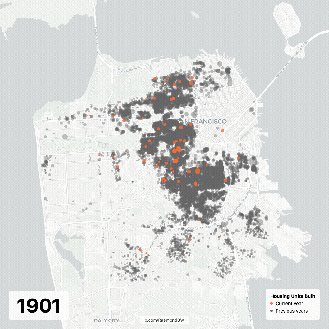 This visualization is part of a series, I'm working on, attempting to visualize the San Francisco housing shortage. Some other interesting plots are visible here: https://raemond.com/sf_development/ The data is all sourced from the SF opendata portal https://data.sfgov.org/