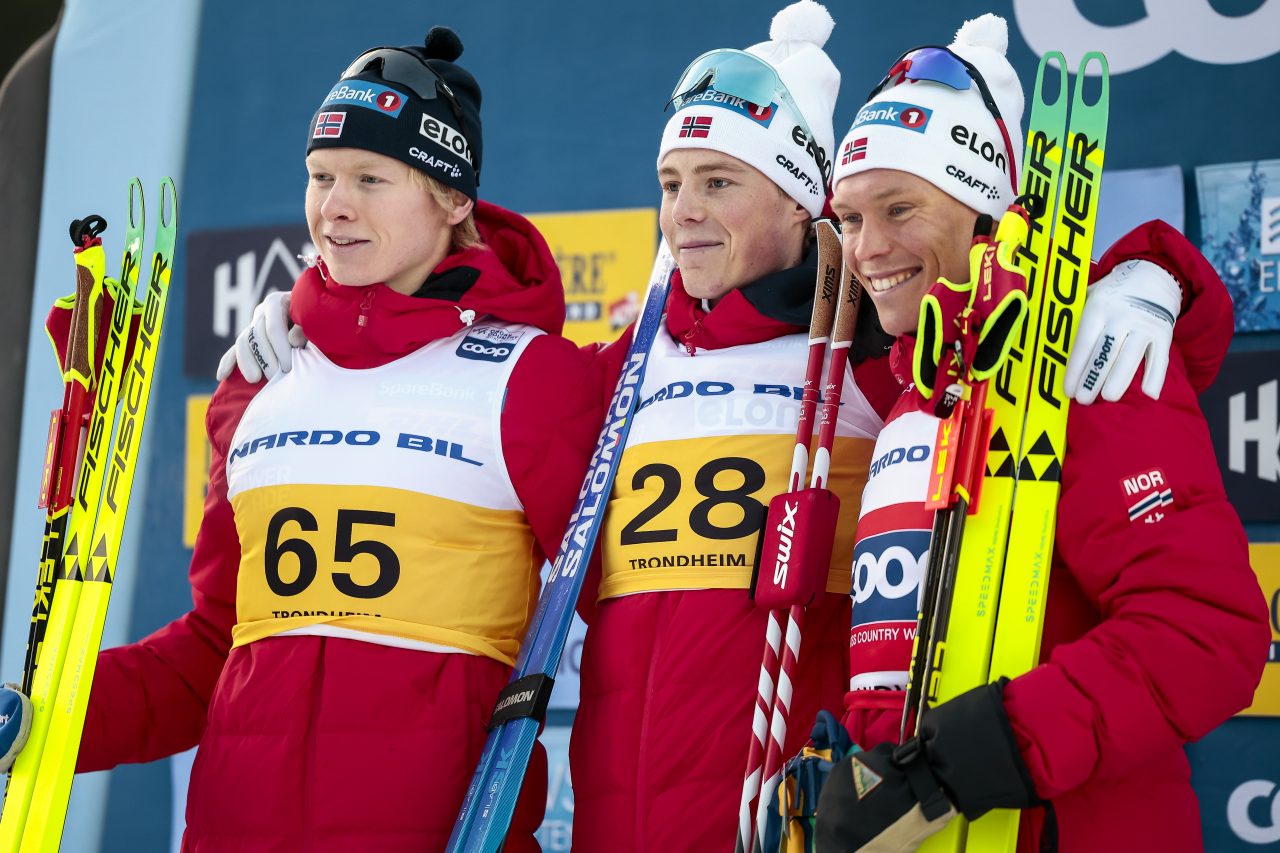 Norway’s Andreas Fjorden Ree (NOR), Einar Hedegart (NOR), Martin Loewstroem Nyenget (NOR), (l-r) share the podium after the 10km freestyle Trondheim (NOR) last weekend. (Photo: Modica/NordicFocus)