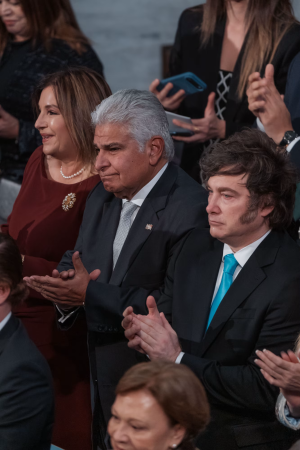 The president of Argentina, Javier Milei (right), was among guests invited to Wednesday’s Peace Prize ceremony by winner Maria Carino Marchado. PHOTO:©Nobel Prize Outreach-Helene Mariussen