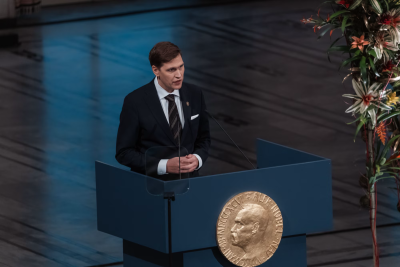Nobel Committee leader Jørgen Watne Frydnes, delivering his Nobel address on Wednesday. PHOTO:©Nobel Prize Outreach-Helene Mariussen