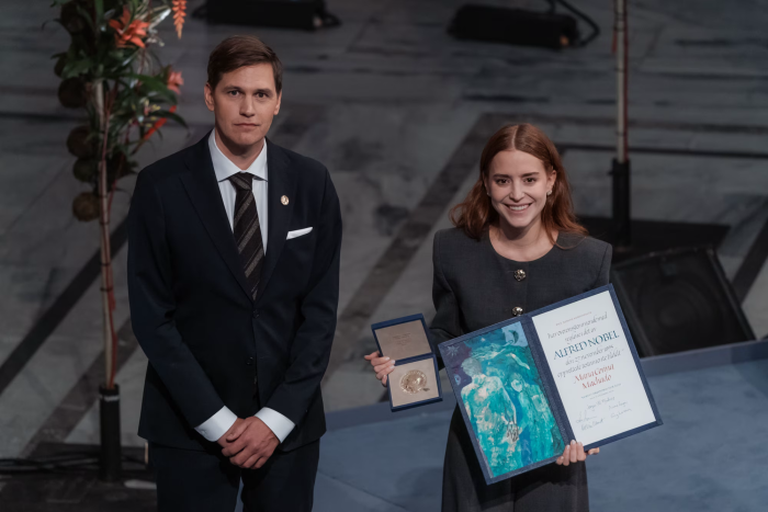 Nobel Committee leader Jørgen Watne Frydnes with the Peace Prize winner’s daughter Ana Corina Sosa Machado, who delivered her mother’s speech and accepted the Peace Prize on her mother’s behalf. PHOTO: © Nobel Prize Outreach – Helene Mariussen