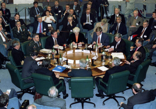 The Bosnian war also was a defining moment for Europe. The initial response from European powers when war broke out on their continent in the 1990s was mostly hands-off. Then the Europe-backed United Nations Protection Force that did respond was handcuffed by insufficient personnel, the absence of effective weapons deployments, and rules of engagement distributed across so many capitals that it weighted the power of “no.” But out of that experience—of European capitals standing by powerlessly and watching Washington halt slaughter in Europe’s southeastern corner—came the roots of the still-evolving European common defense, foreign, and security policy, as well as Europe’s efforts to play a much stronger role in helping defend Ukraine than it did in protecting the victims of aggression in Bosnia.