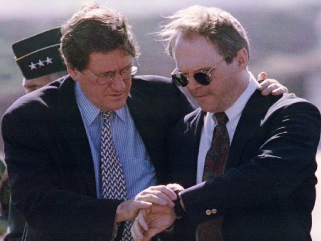 US envoy Richard Holbrooke checks the time on his deputy Christopher Hill’s watch after landing in Sarajevo October 5, 1995. Holbrooke, Hill, and other US officials shuttled between Zagreb, Sarajevo, and Belgrade through the summer and fall of 1995, eventually succeeding in getting the three warring factions around a negotiating table at Wright-Patterson Air Force Base in Dayton, Ohio, where they hammered out the peace accords that would end the war in December. (Oleg Popov/Reuters)