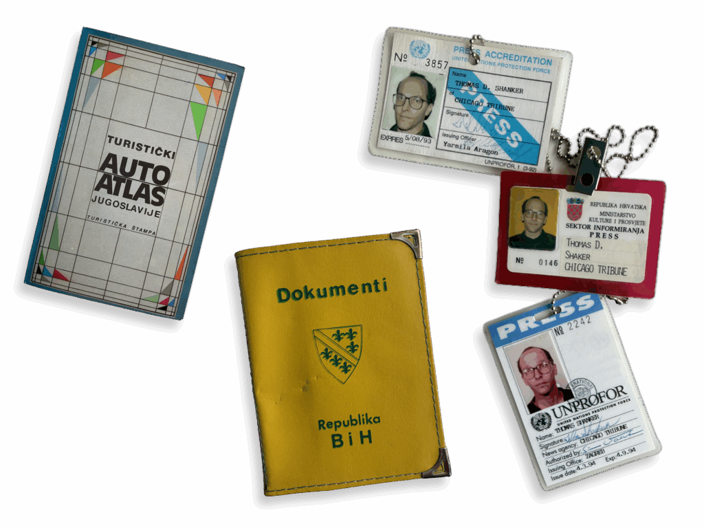 “The real action was deep in the provinces, far from the cameras,” Newsday reporter Roy Gutman recalled. To cover the Bosnian war, reporters accepted new levels of risk, crossing heavily guarded checkpoints and closed borders. The author’s press passes, atlas, and Bosnian papers are pictured here.