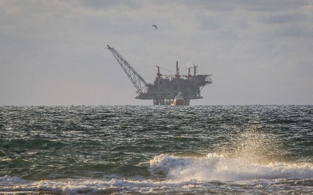 View of the Israeli Leviathan natural gas field gas processing rig as seen from Dor Habonim Beach Nature Reserve, on January 1, 2020. (Flash90/File)