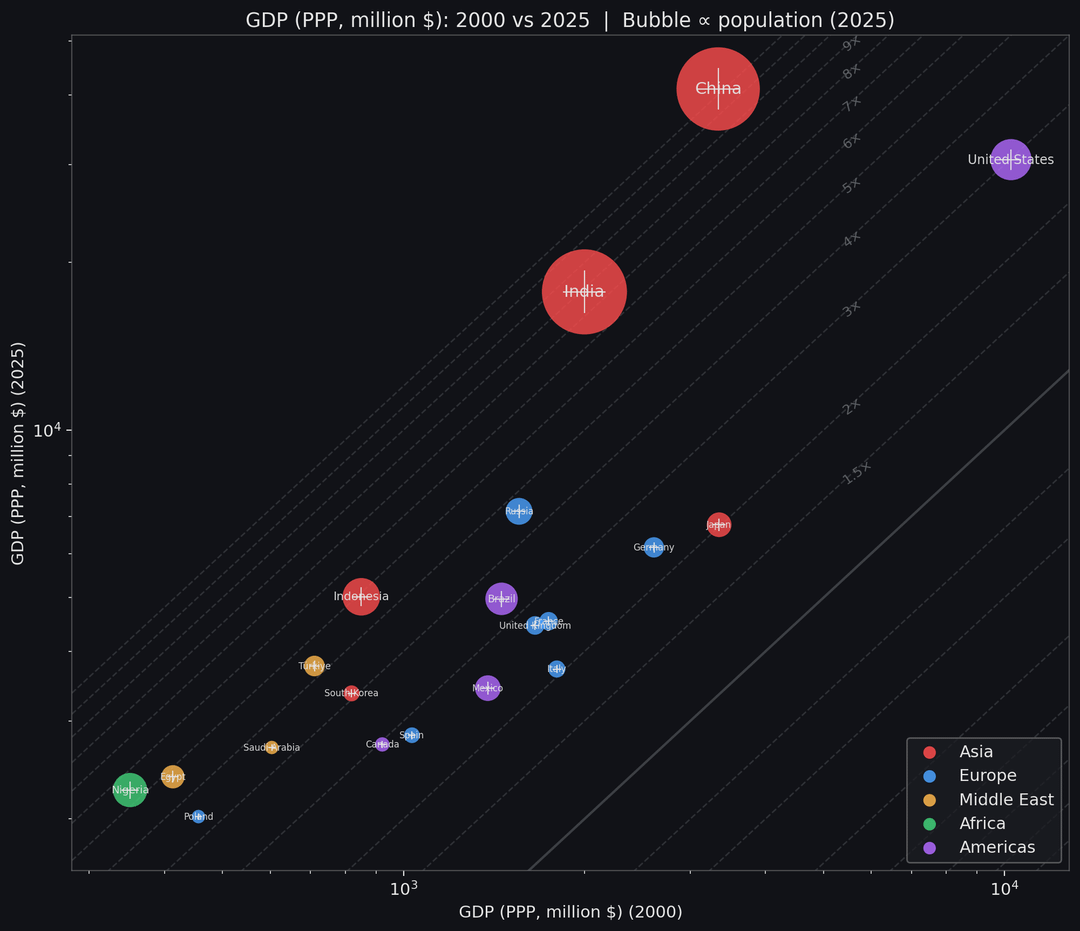 The diagonal lines indicate how many times richer an economy became: the solid line is “no change” (same GDP in 2000 and 2025), dashed lines are 1.5×, 2×, …, 16× higher 2025 GDP. Countries above the main diagonal grew faster than the world average; those below it lagged behind.